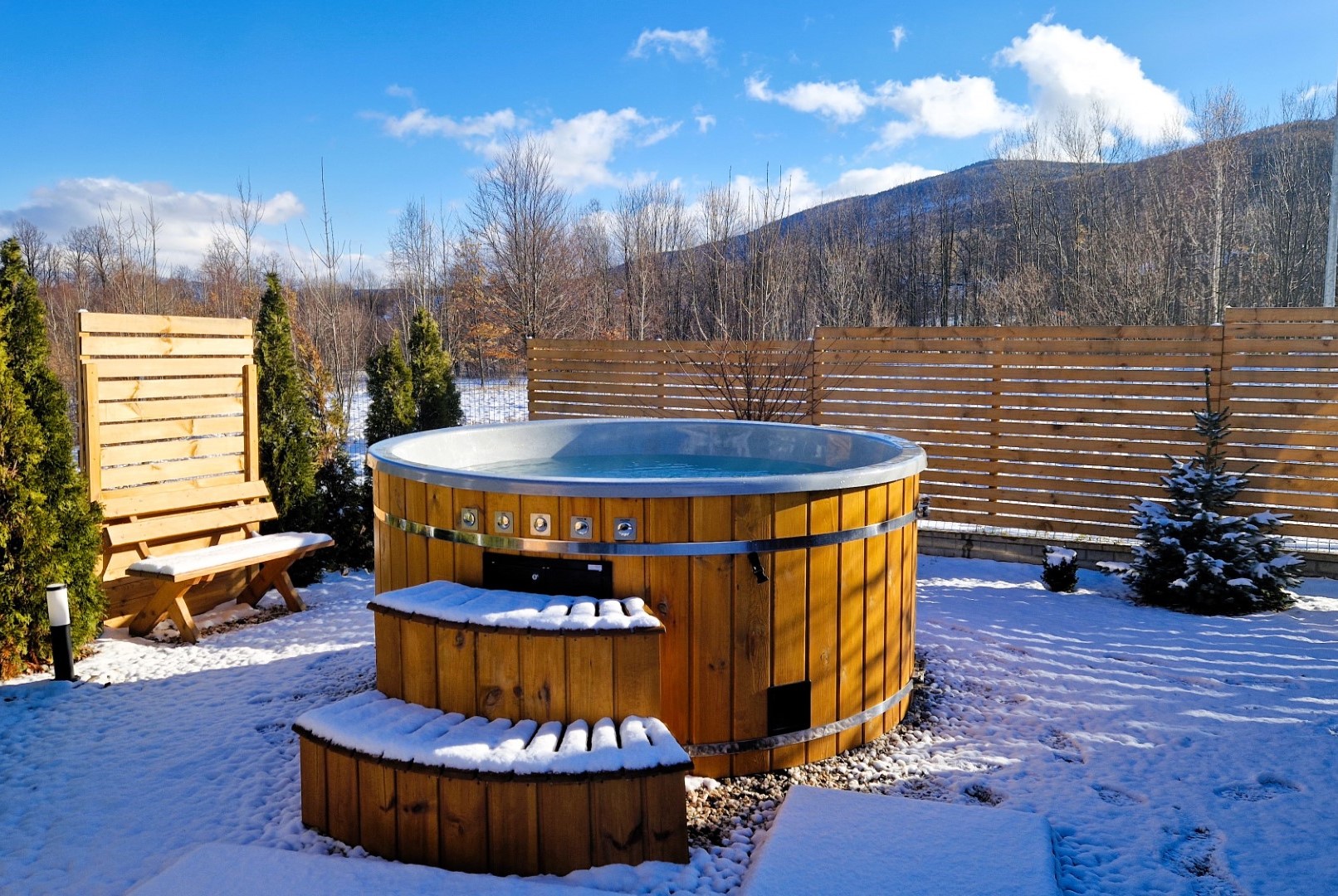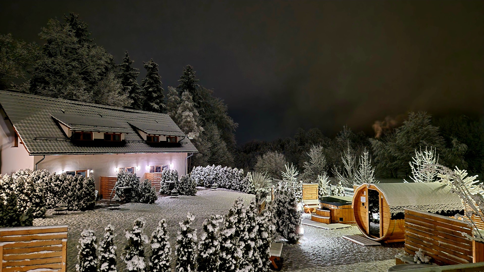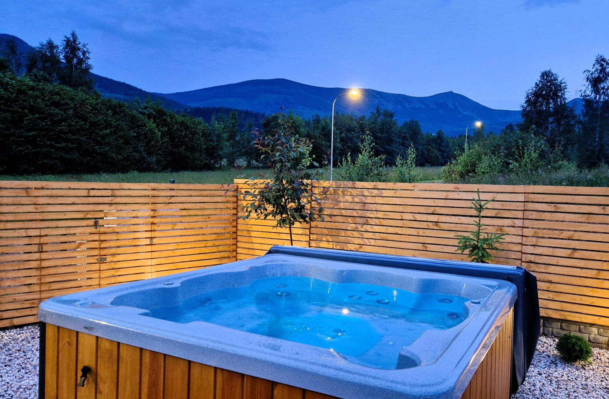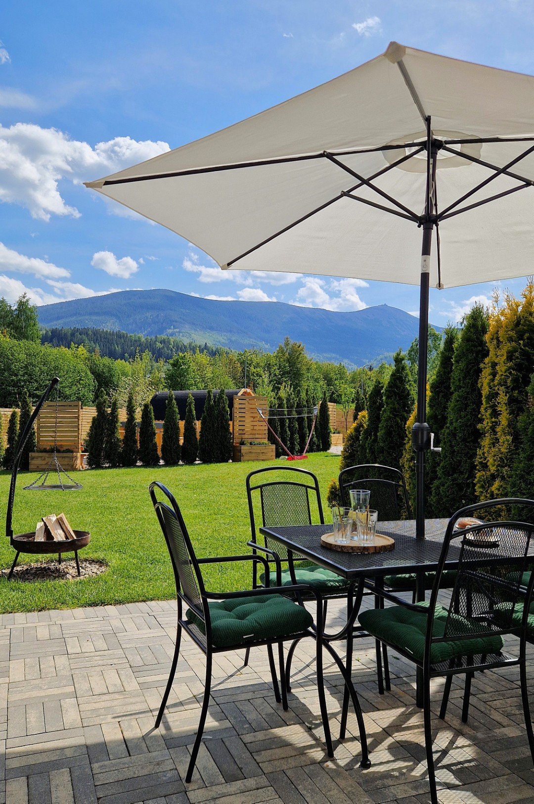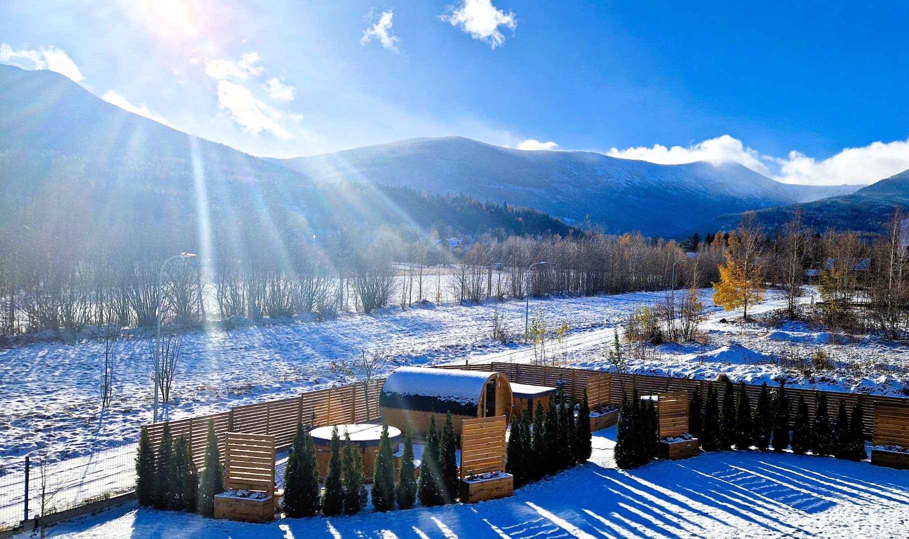 Domek Komfortowy przygotowany jest do wypoczynku czterech – sześciu osób. Składa się z dwóch kondygnacji oraz tarasu. Na parterze znajduje się pokój dzienny z w pełni wyposażoną kuchnią, część jadalniana z dębowym stołem oraz część wypoczynkowa z kominkiem (darmowy dostęp do drewna). Przy Domku prywatny taras wraz z grillem/ogniskiem i leżakami. Z okien oraz tarasu rozciąga się panoramiczny widok na pasmo Karkonoszy. Na piętrze znajdują się dwie dwuosobowe sypialnie z widokiem na góry i las. W domu jest jedna łazienka z prysznicem. Dom posiada integralne wejście i prywatny taras oraz darmowe miejsce parkingowe, na terenie obiektu plac zabaw dla najmłodszych. Dostęp do Strefy SPA (płatne dodatkowo).